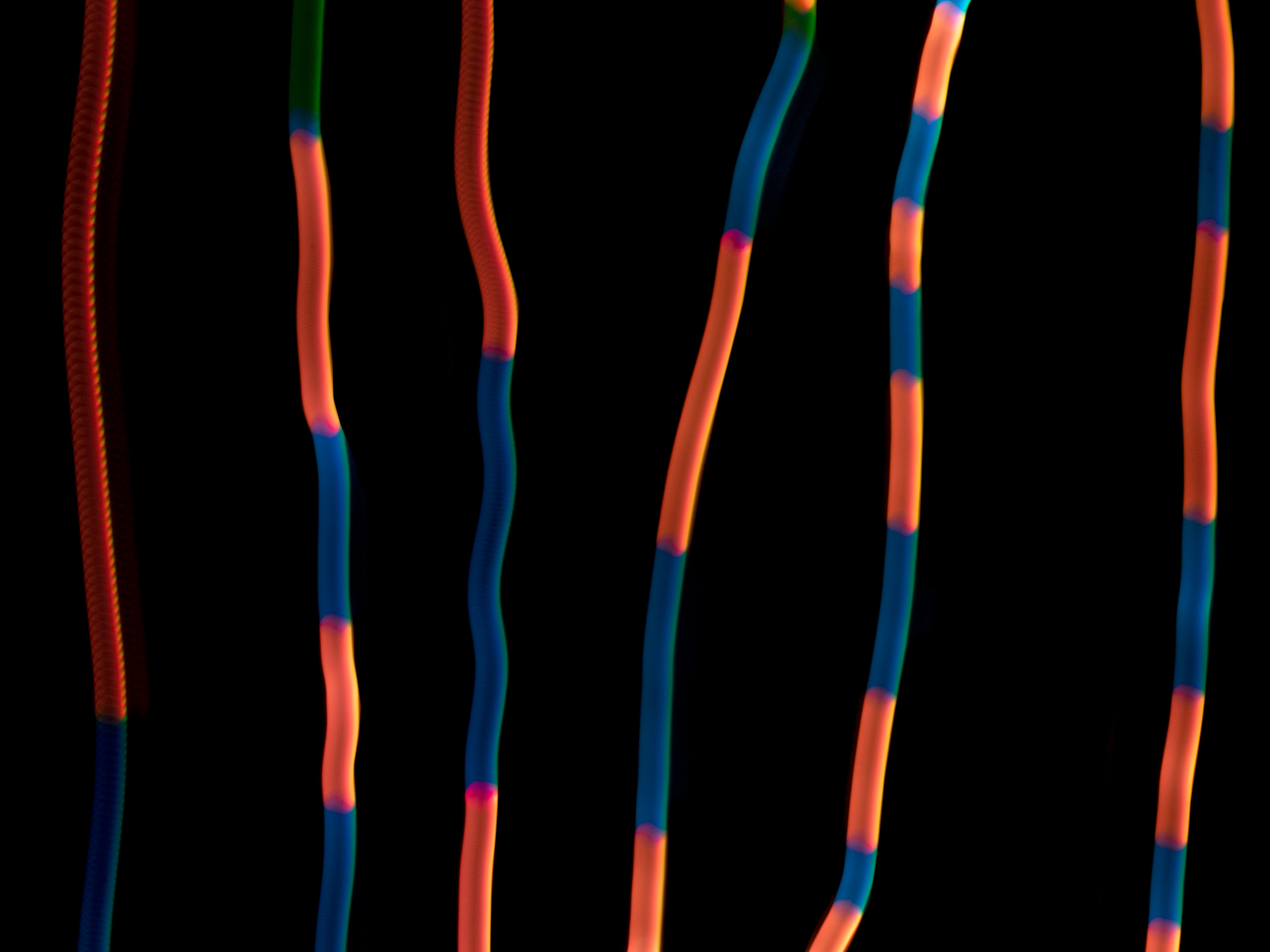 RGB is an additive colour space which means combining red, green and blue will produce white. When the LED is moved within a small area, the brightness concentrates in a smaller area. When the lines are more spread out, the light is more distributed, and you can see more variations in colour. Moving the LED swiftly through the air creates a more textural stroke. It is reminiscent of a snake or x-ray. Attempting to draw a straight line is difficult. With slower movements, the camera captures the changes in colour. In this instance, the colours change at regular intervals. Testing Backgrounds