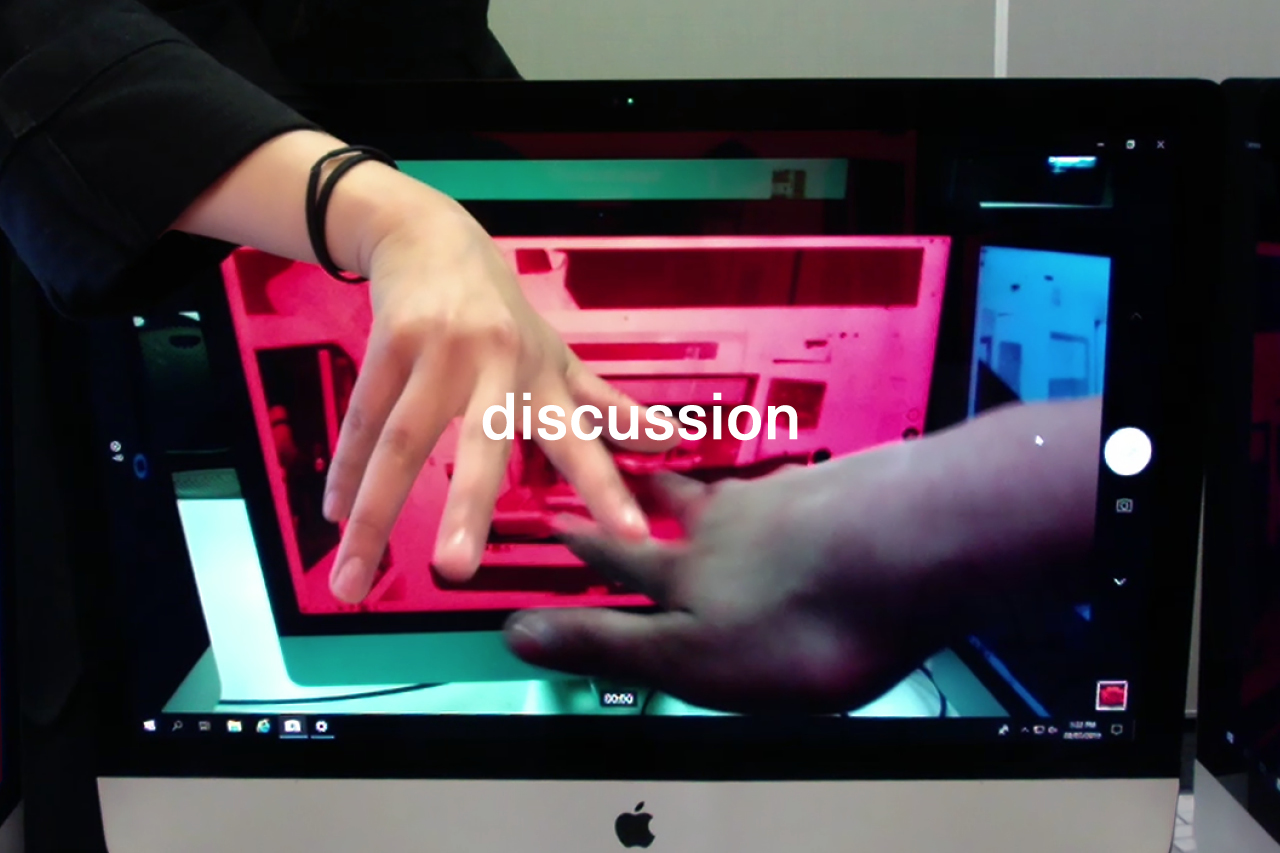- Scale of things become distorted in the feedback loops. In clips with my hand, you can see it appears larger on some screens because it is close to the webcam.